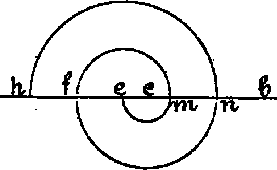 Черчение спиральных линий также не представляет особых затруднений. Проводится прямая hn, по которым должны быть расположены центры полуокружностей, составляющих спираль. Отмечают точку с и проводят из нее полуокружность em. Вбивают в точке е колышек, принимают его за центр и проводят полуокружность mf. Затем снова берут за центр точку с и описывают полуокружность радиусом сf. После этого центр переносят в точку e и описывают полуокружность радиусом en (рис.5). [2]