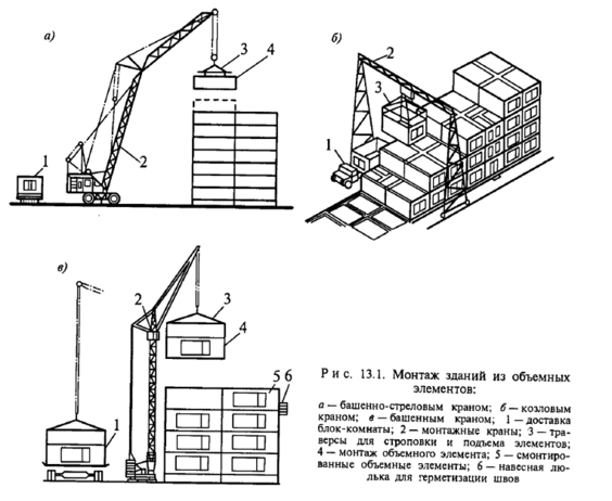 Последовательность монтажа, монтажные механизмы. Нулевой цикл здания выполняют традиционными методами. Особое внимание уделяют геодезическому контролю работ, обязательному соблюдению допусков по горизонтали, вертикали и точности размеров сооружения в плане. Последовательность монтажа здания из объемных элементов определяется конструкцией блоков, способами их стыкования, применяемыми монтажными механизмами.