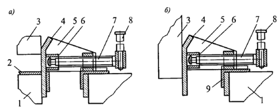 а — при установке элемента на элемент; б— то же, для объемных элементов первого яруса; 1 — ранее установленные элементы; 2 — подготовленное основание (слой раствора); 3 — устанавливаемый элемент; 4 — фиксирующая плоскость; 5 — упор; 6 — опорная пята; 7 — винт; 8 — вороток; 9 — опорный уголок