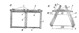 Рисунок 10. Конструктивные решения убежищ, выполненные из дерева а – безврубочная конструкция; б – сооружение податливой конструкции; 1 – проволочные скрутки; 2 – элементы наката; 3- стена; 4 – распорки; 5 – стойка; 6 – прогон; 7 – гидроизоляция; 8 – амортизационный слой; 9 - лежень