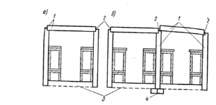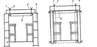 В качестве стеновых элементов убежищ можно использовать поставленные на ребро плиты сплошного и пустотелого сечения (рисунок 4). Для повышения несущей способности стеновых панелей в поперечном направлении устанавливают опорные рамы. Поскольку монтаж стен достаточно трудоёмок, эти же рамы выполняют роль элементов, обеспечивающих устойчивость плит, установленных на ребро.