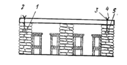 Рисунок 5. Поперечный разрез убежища со стенами из грунтонабивных мешков. 1 – стена; 2 – железобетонная плита; 3 продольный арматурный стержень; 4 – проволочные скрутки; 5 – продольный деревянный брус.