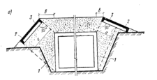 Снизить объём и габариты грунтовой обсыпки и одновременно не допустить увеличения нагрузки на наружные стены быстровозводимых убежищ можно путём изменения конструкции обвалования. С этой целью бровку откосов размещают вблизи наружных граней стен, а на откосах укладывают ребристые плиты с сохранением не заполненного грунтом пространства между рёбрами и под полкой (рисунок 12). На откосах с каждой стороны размещают по одной плите шириной 1,5 м. Вынос брови откосов должен быть таким, чтобы проекция его верхней точки (бровки) под углом 90° попадала на угол сооружения. Наклон откосов обвалования можно принимать в этих условиях более крутым, чем рекомендуется нормами, например, 1:1,5 или 1:2.