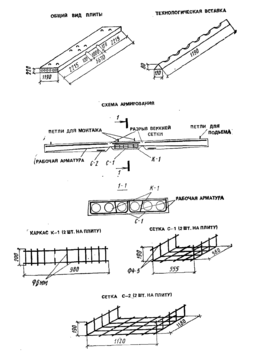 Общий вид трёхзвенных плит, схема их армирования и элементы технологических вставок для опалубки размером 5670х1190 мм показаны на рисунке 14.