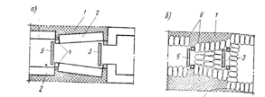 Рисунок 11. Узел примыкания входной части к остову убежищ. а – для сооружений со стенами из бетонных блоков; б – для сооружений со стенами из грунтонабивных мешков; 1 – слой мятой глины; 2 – блок тамбура и предтамбура; 3 – герметическая дверь; 4 – конопатка пакелейц или ветошью; 5 – защитногерметическая дверь; 6 – грунтонабивные мешки