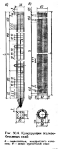 Забивные железобетонные сваи и сваи-оболочки получили наибольшее распространение и применяются в различных конструктивных модификациях. Железобетонные сваи изготовляют из обычного или предварительно-напряженного железобетона. Наиболее распространены железобетонные призматические сваи сплошного квадратного сечения (рис. 30.4). Такие сваи применяют размерами сечения от 200X200 до 400X400 мм, длиной 3—24 м. Интервалы длины для таких свай приняты для длин 3—6 м через 0,5 м и для длин 6—24 м через 1 м. Ненапряженные сваи изготовляют длиной 3—16 м, а предварительно-напряженные-— длиной более 16 м. Сплошные призматические железобетонные сваи армируют по расчету продольными стержнями из горячекатаной арматуры стали периодического профиля диаметром 12—22 мм класса А-II и поперечной арматурой спиралями, сетками в голове сваи и петлями из обыкновенной арматурной проволоки класса A-I диаметром 5—6 мм. Бетон для свай с ненапряженной арматурой принимается марки 200, а для свай с предварительно-напряженной арматурой — марки 300. В качестве крупного заполнителя для бетона применяют щебень крупностью не более 40 мм.