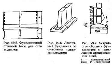 Применение сборных элементов в фундаментостроении началось несколько позже, чем в строительстве наземных конструкций. Это объясняется особенностями работы фундаментов. В 1933—1935 гг. автором в его исследованиях была показана полная возможность перехода к устройству фундаментов из сборных элементов и предложена методика их проектирования. Основную трудность перехода на фундаменты из сборных элементов составляет проектирование такого набора типоразмеров блоков, при котором удовлетворяются требования соответствия площади подошвы фундамента несущей способности грунта и требования жесткости конструкции. В зависимости от конструктивной схемы здания сборные фундаменты могут осуществляться в виде сплошных ленточных фундаментов под стены, отдельных фундаментов-столбов, нагрузка на которые передается через рандбалки, и одиночных фундаментов под отдельные опоры (столбы или колонны). Кроме того, в самое последнее время получили распространение так называемые прерывистые ленточные фундаменты под стены. В таких фундаментах верхняя часть, выкладываемая из блоков, образует непрерывную стенку-ленту, а нижняя образуется из блоков-подушек, укладываемых с некоторыми промежутками. Рассматривая конструкции сборных фундаментов, можно установить, что для их устройства необходимо два основных типа сборных элементов: