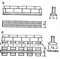 Размеры фундаментных блоков-подушек, как правило, не совпадают с необходимыми размерами площади фундамента, полученной расчетом. В таких случаях ширина блока-подушки получается больше расчетной ширины фундамента. Чтобы уравнять расчетную площадь фундамента и площадь, получающуюся при укладке блоков, разрешается укладывать блоки с разрывами между ними. В качестве примера на рис. 29.8 показан фундамент под стену с расчетными размерами и эквивалентный ему прерывистый фундамент из блоков. В первом приближении можно считать, что расчетная площадь подошвы фундамента F=Lb должна быть равна площади подошвы прерывистого фундамента F пр=[L-с(n— 1)]b гр. Однако из рис. 29.8 видно, что вследствие разрывов между блоками сплошное давление на грунт передается не непосредственно по подошве, а по плоскости, лежащей на некотором расстоянии от подошвы фундамента. Следовательно, осадку каждого блока следует рассчитывать как осадку отдельного фундамента с учетом влияния соседних блоков и образования арочного эффекта. Такой расчет затруднителен. Поэтому на практике разрешается рассчитывать прерывистый фундамент в целом, принимая среднее давление на грунт несколько большим, чем нормативное.