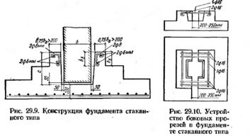 Основной тип сборного фундамента под колонну — башмак стаканного типа. Его изготовляют из железобетона, а конструкция башмака должна полностью соответствовать рекомендациям и требованиям, изложенным в разделе железобетонных конструкций. Конструктивное оформление фундаментного блока- башмака стаканного типа показано на рис. 29.9 и 29.10.