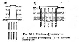 Группу свай, образующую свайный фундамент, поверху связывают жесткой конструкцией в виде балки или плиты, обеспечивающей передачу давления от сооружения на все сваи и препятствующей горизонтальному перемещению верхней части последней. Конструкции, связывающие головы свай, называют ростверками и выполняют в зависимости от материала свай и постоянного уровня грунтовых вод из дерева, бетона или железобетона. Различают ростверки высокие и низкие (рис. 30.1). Высокими называют ростверки, нижняя плоскость которых лежит выше поверхности грунта. Такие ростверки устраивают, когда поверхность грунта покрыта водой, например при строительстве набережных, мостовых опор и т. д. Однако возможно устройство высоких ростверков и при строительстве гражданских зданий, например при устройстве технического подполья.
