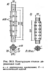 Деревянные сваи изготовляют из лесоматериалов хвойных пород. Деревянные сваи могут быть цельными, изготовленными по длине из одного бревна, и срощенными по длине из двух бревен. Сращивание свай более чем из двух бревен не допускается (рис. 30.3). Возможно применение пакетных свай, сплоченных из нескольких цельных или ерошенных по длине бревен или брусьев. Диаметр бревен для цельных и составных по длине свай в тонком отрубе должен быть не менее 18 см, а для пакетных свай — не менее 16 см. При конструировании деревянных свай следует руководствоваться сортаментом свайного леса по ГОСТ 9463—60.