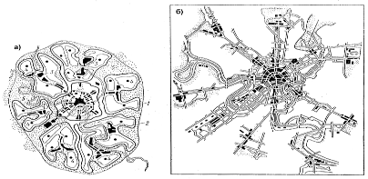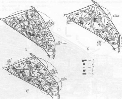 а) – система планувальної структури; б) – схема загальноміського центру; 1- межи планувальних зон; 2 – те ж, районів; 3- центральний район і центри планувальних зон; 4 – центри планувальних районів; 5 – зелені насадження загальноміського користування.