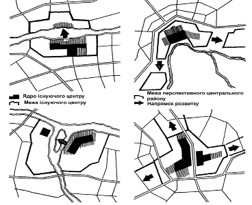 Рис.1 - Схеми формування й розвитку громадських центрів у містах