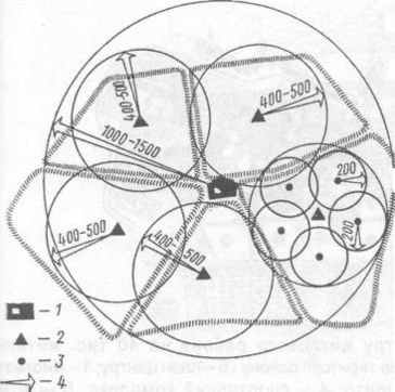 1 - центр жит-лового району; 2 - центр мікрорайону; 3 - блок обслуговування групи будинків; 4 - радіус обслуговування.