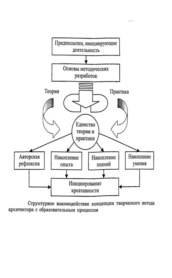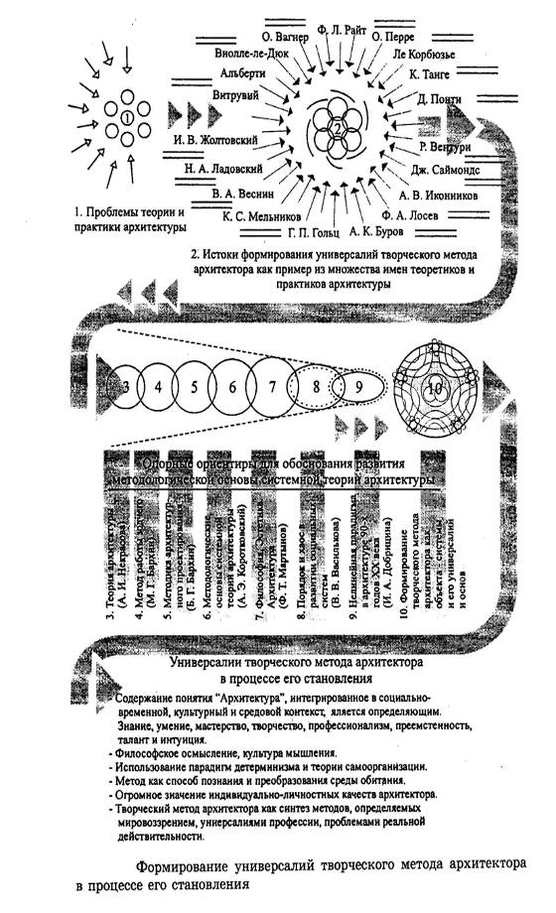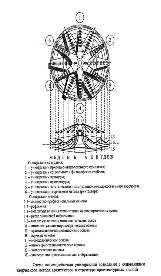 Образовательный процесс должен осуществляться не просто через сумму отдельно взятых методов, способов, подходов, не через отдельно взятые аспекты философии и науки, композиционно-художественные средства и приемы, а непосредственно через творческий метод архитектора как целостную совокупность универсалий, значений и смыслов.