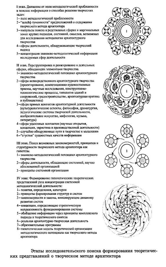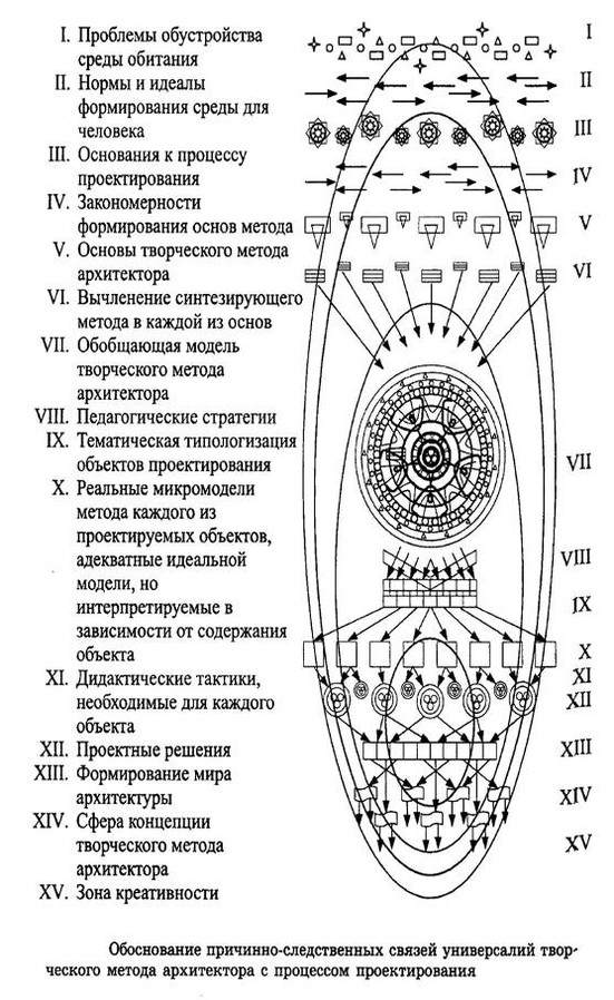 К структуре методических основ творческого метода архитектора автором разработаны: идеология опережающего профессионального развития; матрица метода тактико-стратегического развития процесса проектного моделирования, матрица метода архитектора; категории эмоционально-тектонической содержательности; собирательная классификация методов; древо потоков методологического творчества; педагогические стратегии и тактики.
