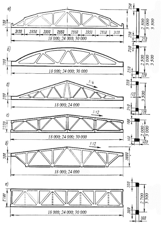 а – сегментная; б – арочная; в – треугольная; г – полигональная; д – то же, с пониженным нижним поясом; е – с параллельными поясами