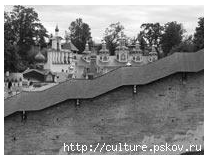 Стены Печорской крепости идут по склону глубокого оврага, как бы огибая лощину, на дне которой протекает ручей Каменец. Общая длинна стен 726 метров, их толщина 2 метра. Сегодня крепостные сооружения состоят из 9 башен. Монастырь выдерживал осады отрядов армии Стефана Батория (в Ливонскую войну), польского гетмана Ходкевича, шведских королей Карла-Густава и Карла XII. Военная история обители, славная героизмом ее защитников, - стрельцов и монахов, окончилась с Северной войной, с перемещением западных рубежей России к Балтийскому морю.