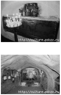 В монастырском пещерном некрополе можно видеть склепы, до самых сводов заполненные ветхими почерневшими гробами, в то время как не замечено никаких признаков тления тел усопших. Сейчас в пещерах проделаны шесть длинных подземных галерей. Среди захороненных здесь - представители прославленных русских родов: Пушкиных, Назимовых, Бутурлиных, здесь покоятся родственники М. И. Кутузова, поэта А. Н. Плещеева, композитора М. П. Мусоргского.