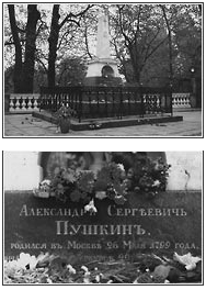 Пройдя через Анастасьевские ворота и поднявшись по древним ступеням на Святую гору, мы окажемся у стен древнего Свято-Успенского собора. Здесь, у его алтаря, находится дорогая для каждого русского сердца могила. На памятнике из белого мрамора надпись: "АЛЕКСАНДРЪ СЕРГЕЕВИЧЪ ПУШКИНЪ / Родился въ Москве 26 мая 1799 года / Скончался въ С-Петербурге 29 января 1837 года".