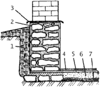 1,7 - глина; 2 - цементная штукатурка, покрытая битумом с наружной стороны; 3,5 - гидроизоляция; 4 - цементный пол; 5 - бетонная подготовка