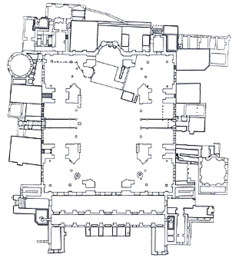 С запада перед Софийским собором находился обширный атриум с фонтаном для омовений: он не сохранился, но уцелели два нартекса, внешний и внутренний, через которые из атриума проходили в церковь. Существовал еще один - торжественный вход, ведший во внутренний нартекс с юга, со стороны Августейона - центральной площади Константинополя, на которой против собора начинался огромный ансамбль Большого императорского дворца, где стояли здание Сената и высокая колонна с конной статуей Юстиниана наверху.