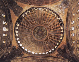 Центром собора стал охвативший его внутреннее пространство гигантский купол. Четыре мощные арки высоко держат его над молящимися. Гибкое движение криволинейных очертаний передается большим полукуполам с востока и запада, поддерживающим их меньшим полукуполам и растворяется в ажурных рядах колоннад. Благодаря уменьшению и дроблению архитектурных элементов книзу вся структура кажется лишенной тяжести, как бы висячей. Поверхности при взгляде из центра кажутся вогнутыми, вмещающими пространство, уступающими ему. Купольный балдахин образован идеальным, как бы бестелесным ритмом поверхностей и линий, оболочка здания дематериализуется, становится тонкой и гибкой.