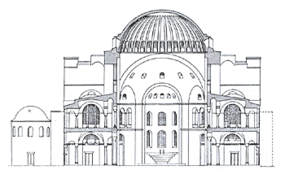 Византийцы считали, что купол Софии подвешен к небесам золотой цепью. Этот эффект неожиданности византийские архитекторы несомненно учитывали, но вовсе не ради него они оставили фасады Великой церкви без всякой декоративной обработки.