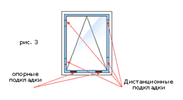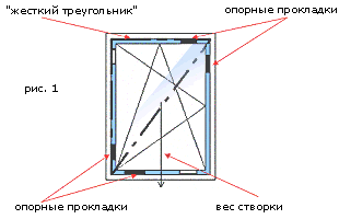 А) Прокладки под стеклопакет на несущие фальцевые вкладыши установить плотно, в натяг, чтобы створка со стеклопакетом образовывала жесткий треугольник (рис.1). Для этой цели используют специальную пластмассовую лопаточку. Если этого не выполнить, створка провиснет в первые же дни.