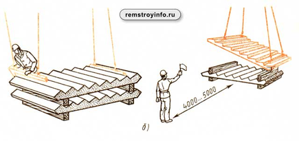 Лестничный марш стропят вилочным захватом или четырехветвевым стропом с двумя укороченными ветвями (см. схему ниже, поз. б), которые придают поднимаемому элементу наклон немного больше проектного. Аналогичным способом выполняют строповку маршей, объединенных с полуплощадками.