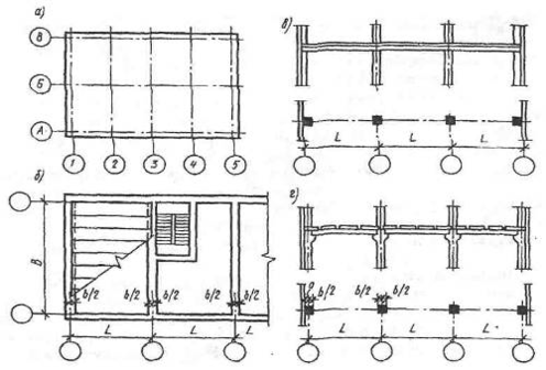 (в - «нулевая» привязка наружных граней колонн; г - их привязка на расстоянии а)