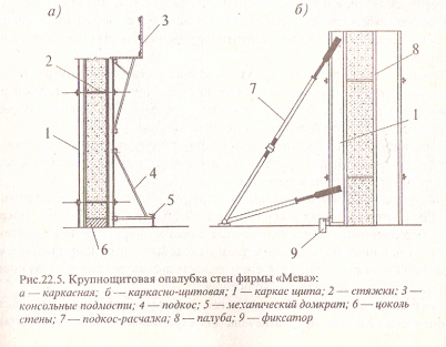 В зависимости от толщины бетонируемой конструкции и требований к качеству поверхностей щит опалубки выполняют из несущего каркаса и палубы на всю плоскость опалубливания или из отдельных инвентарных щитов, объединяемых системой схваток или горизонтальных стяжек, пропускаемых через тело будущей бетонной конструкции и устанавливаемых до бетонирования. Для обеспечения устойчивости опалубки и выверки ее в проектное положение используют различные системы подкосов и раскосов, механическими винтовыми домкратами и регулировочными устройствами.