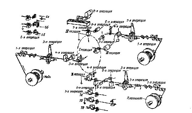 Изготовление трёхзвенных вводов начинается с рихтовки медной проволоки (операция 1), подачи на необходимую длину с одновременным центрированием (операция 2), зажима в губках корпуса позиционного барабана (операция 3 на позиции I), отрезки медного звена (операция 4).