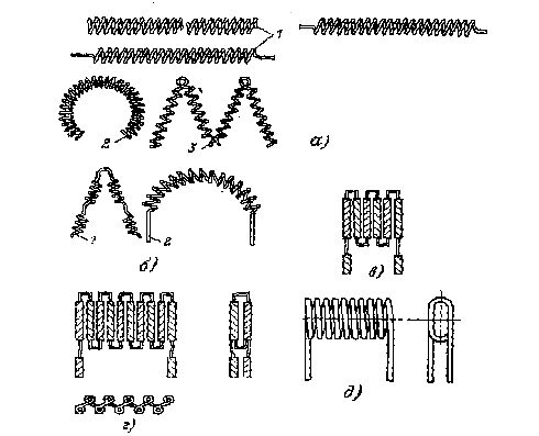 Для изготовления тела накала применяются вольфрамовые проволоки марок ВА, ВМ, ВТ диаметром от 0,01 до 1,25 мм. В качестве керна используется молибденовая проволока марки МЧ или стальная марки 10. Спирали по форме можно разделить на следующие основные группы (рис.3.4):