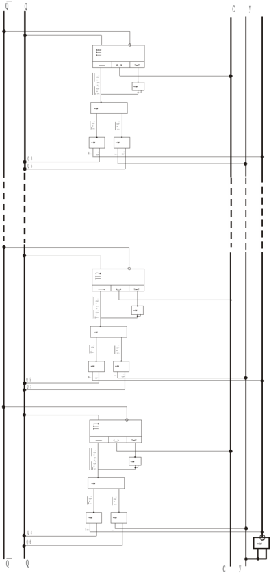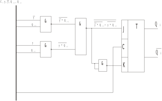 тобы получить выражение, описывающее логику формирования сигналов на входе триггера, используем уравнение: Ji = y · Qi+3 + y · Qi-3 , где i = 1..8, причем если результат подстановки i окажется меньше или равным нулю, то к результату следует прибавить максимальное (в данном случае 8) количество разрядов в проектируемом регистре, если же результат окажется больше максимального количества разрядов (т.е. 8), то из него следует вычесть это максимальное число.