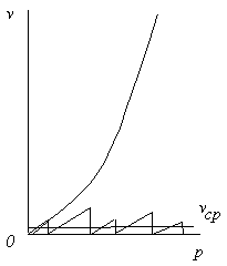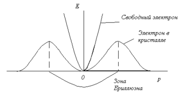 Для электрона в кристалле всё выглядит по другому. Правда, вблизи нулевых значений импульса энергия тоже похожа на параболу, но вдали от нуля это скорее синусоида, т.е. периодическая кривая. Это отличие принципиальное. У свободного электрона при приложении электрического поля энергия его всё время растёт, а у электрона в кристалле она растёт только до некоторого значения, а затем падает. Скорость электрона определяется производной от энергии по импульсу. У параболы скорость всё время растёт (здесь мы не рассматриваем теории относительности, и поэтому не учитываем конечности скорости электрона, которая не может быть больше скорости света). У синусоиды скорость электрона в начале растёт, затем достигает максимума (самый крутой участок кривой) далее падает и достигает нуля, затем начинает изменяться в отрицательную сторону и т.д. Получается, что в следствие периодической зависимости дисперсионной кривой, скорость электрона должна всё время менять направление, и в целом он не должен двигаться.