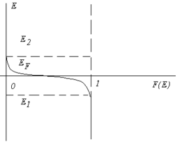 десь функция F располагается горизонтально, а её аргумент E – вертикально. Левая сплошная линия – F(E)=0; правая пунктирная линия - F(E)=1. При Е>E2 вероятность заполнения состояний электронами равна нулю – тока нет. При E
