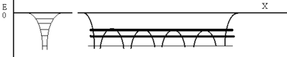 В твёрдых телах ситуация более сложная, так как электроны не свободны. Известно, что в отдельном атоме электрон находится в поле притяжения положительного заряда. Это можно представить себе как потенциальную яму, см. рис. слева. На рис. показана зависимость энергии от координаты для одного атома слева и для кристалла справа. В случае одного атома это просто уменьшение энергии от нуля в бесконечности до минус бесконечности в центре ядра. В потенциальной яме в случае очень малых частиц, когда применимы законы квантовой механики, всё не так, как в классической механике. Существует дискретный ряд разрешённых энергий, с которыми могут существовать электроны в атоме. Причём по принципу Паули на каждом энергетическом уровне может находиться только один электрон. А в случае кристалла, когда атомы расположены строго периодически и на очень близком расстоянии друг от друга, картина принимает вид как на рис. справа (здесь, конечно, изображена одномерная ситуация, а не трёхмерная, для простоты). Видно, что из-за перекрытия потенциальных ям их высота понизилась, за исключением крайних потенциальных ям. Квантовая механика говорит, что в случае очень малых расстояний частицы (в данном случае электроны) могут преодолевать потенциальный барьер, не получая дополнительной энергии. Но вероятность того, что они преодолеют этот барьер, обратно пропорциональна ширине и высоте барьера, и даже в экспоненциальной форме. Поэтому только на атомном уровне сказывается квантовый эффект, который называется туннельным эффектом.