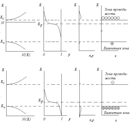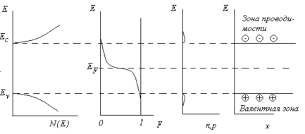 На последнем рис. представлена зависимость энергии от координаты. На дне зоны проводимости есть некоторое количество электронов, у потолка валентной зоны есть некоторое количество дырок. Они, в отличие от электронов, имеют положительный заряд. Так как электроны рождаются при выходе из валентой зоны в зону проводимости электрона, количество их строго равно количеству дырок.