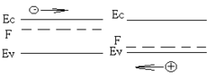 ни одинаковы, так как полупроводник один и тот же, но уровни Ферми находятся на разной высоте, так как слева полупроводник п-типа, и уровень Ферми выше середины запрещённой зоны, а справа полупроводник р-типа, и уровень Ферми ниже середины. Если теперь соединить эти куски, то электроны, которых слева много, будут диффундировать направо, а дырки, которых много справа, будут диффундировать налево (указано стрелками). Это приводит к тому, что левая часть структуры заряжается положительно, а правая – отрицательно.