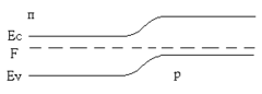 Теперь рассмотрим количество носителей заряда (электронов и дырок). Слева и справа, где зонная диаграмма горизонтальна, они велики, так как уровни Ферми близки к соответствующим границам зон. А там, где эти границы искривляются, уровень Ферми удаляется от одной границы и приближается к другой. Из рис. видно, что в области п-типа электронов становится гораздо меньше, чем было в левой части. А в области р-типа дырок значительно меньше, чем было в правой части.