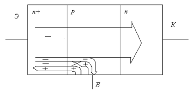 Рассмотрим более внимательно составляющие токов в биполярном транзисторе п-р-п типа. Это изображено на рис.: