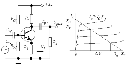 Предположим, что мы решили найти коллекторное напряжение с помощью графического метода. Для простоты считаем, что Rэ = 0 Rн = бескон. Очевидно: