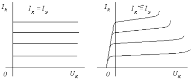 Мы видим, что к эмиттерному р-п переходу приложено прямое смещение: плюс к базовому контакту, а минус к эмиттерному контакту. К коллекторному р-п переходу приложено обратное смещение. В этом случае у хорошего транзистора коллекторный ток лишь незначительно меньше эмиттерного. Значит, вольамперные характеристики должны быть горизонтальными:
