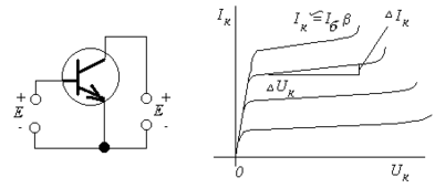 В схеме ОЭ входной сигнал подаётся на базу, а выходной сигнал снимается с коллектора. Схема и выходные характеристики изображены на рис.: