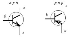 Как видно, схематическое изображение совсем не похоже на их действительную конструкцию. Но так принято. Кружок символизирует корпус транзистора. Индексом "б" обозначен контакт к базе, "к" обозначает контакт к коллекторной области, а "э" – к эмиттерной области. Направление стрелки у эмиттерного контакта определяет тип транзистора (п-р-п или р-п-р).
