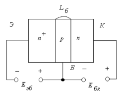 Итак, на рис. изображены три слоя: с электронной электропроводностью, причём сильной, что обозначает плюс - эмиттер, дырочной - база, и снова электронной, но более слабо легированной (концентрация электронов самая малая) – коллектор. Толщина базы, т.е. расстояние между двумя р-п переходами, равное Lб , очень мала. Она должна быть меньше диффузионной длины электронов в базе. Это от единиц до десятка мкм. Толщина базы должна быть не более единиц мкм. (Толщина человеческого волоса 20-50 мкм. Отметим также, что это близко к пределу разрешения человеческого глаза, так как мы не можем видеть ничего меньшего, чем длина волны света, т.е. примерно 0,5 мкм). Все остальные размеры транзистора не более примерно 1 мм.