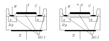 Теперь рассмотрим конструкцию, изображённую на рис. слева. Это полупроводник (например кремний) р-типа, в котором сделаны две области п-типа. Сверху кроме защитного слоя диоксида кремния нанесён ещё тонкий слой диоксида кремния между п-областями. Если теперь подать напряжение между стоком и истоком, то ничего не произойдёт: ток не появится, так как при любом знаке напряжения хоть один из р-п переходов смещён в обратном направлении (это как в биполярном транзисторе при очень толстой базе – два р-п перехода отдельно).