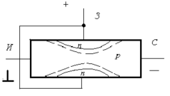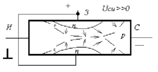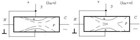 Как видно, здесь тоже три слоя: п-, р-, и п-типа (может быть и наоборот: р-, п-, и р-тип). Между стоком (на рис. обозначен как С) и истоком (И) прикладывается напряжение, такое, что заряды (в данном случае дырки) вытекают из истока и втекают в сток. Значит, к стоку прикладывается отрицательное напряжение, исток заземляется. Из-за наличия р-п переходов область канала сужается, причём на самом деле даже больше, так как р-п переход толстый, у него есть область объёмного заряда (ООЗ), отмеченная на рис. пунктирной линией. К затвору (З) прикладывается положительное напряжение, так что р-п переходы смещены в обратном направлении, и ООЗ расширяется, а ширина канала сужается. Это приводит к уменьшению тока канала (потока зарядов от истока к стоку) – это регулировка тока, которая и даёт режим усиления.