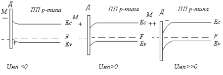 а рис. изображены три зависимости энергии электрона от координаты. Слева представлен случай, когда к металлу (обозначен буквой М) приложено отрицательное по отношению к полупроводнику напряжение. Оно притягивает к поверхности полупроводника дырки, а электроны отталкивает. Иными словами, зонная диаграмма изгибается вверх, и при установлении равновесия дырок у поверхности станет ещё больше, чем было в исходном полупроводнике.